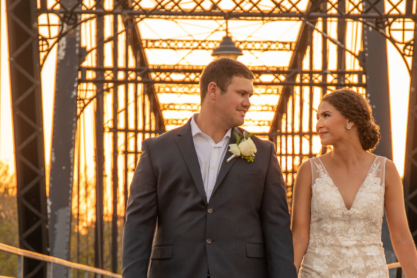 Everlasting Elopements couple looking at each other on a bridge with the sunset behind them at Faust Street Bridge