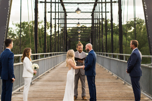 The Faust Street Bridge is suspended over the Guadalupe River, in New Braunfels, TX. The bridge is a magical backdrop for elopements and small weddings.  Though this location does stay open to the public it boasts multiple beautiful photo opportunities, especially at sunset!  With a full ceremony setup with aisle, chairs, and arch this beautiful location will impress your guests as they watch your beautiful nuptials while listening to the beautiful sounds of nature.  Pair this location with the nearby Milltown Gallery reception hall at the entry of the Bridge and you have the perfect and affordable ceremony and reception event!