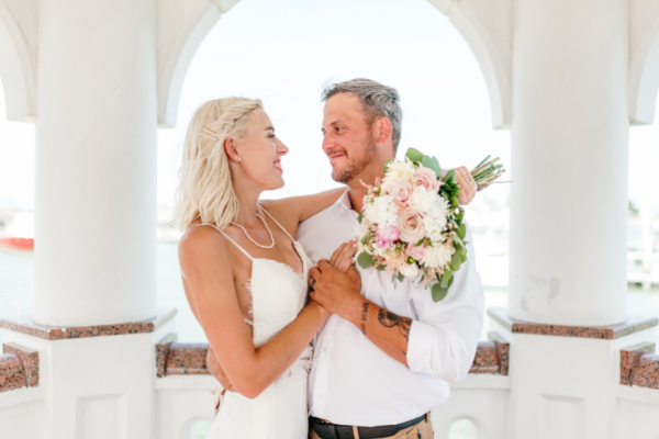 Everlasting Elopements couple holding each other looking at the camera standing by the ocean and in front of a gazebo at Miradores