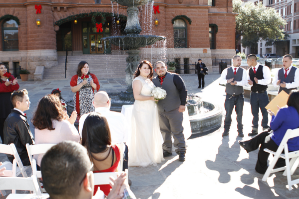 The San Antonio Courthouse Fountain with the backdrop of the County Courthouse hosts a beautiful and affordable backdrop for simpler small weddings and elopements. For couples who love the beat of the city, this is the perfect historic venue in the heart of downtown San Antonio! Celebrate your love in front of gorgeous fountain, surrounded by Romanesque Revival architecture, and just moments away from the Cathedral of San Fernando and the San Antonio River Walk.